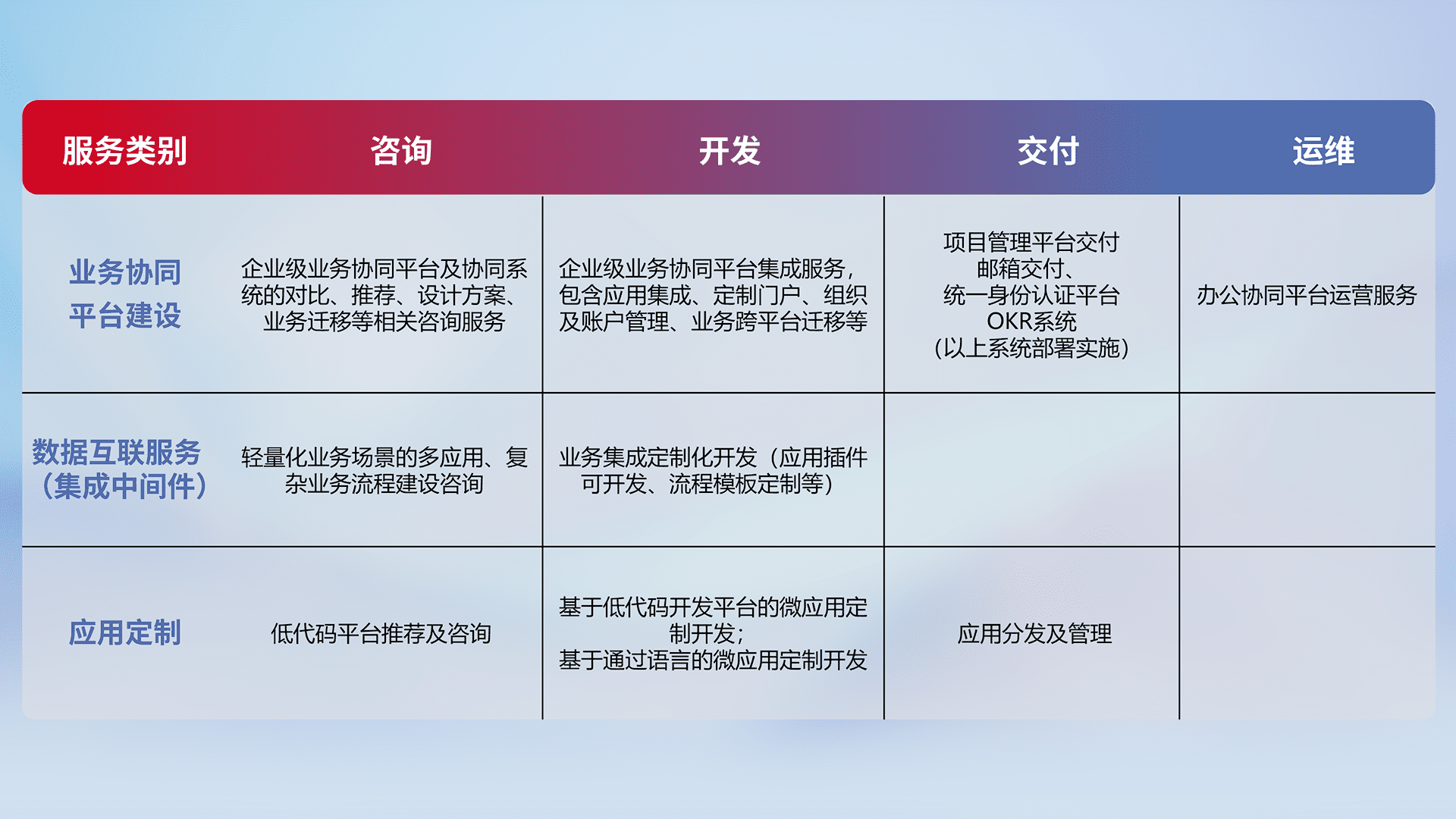 针对钉钉、、、企微、、、IDaas等平台级产品提供产品的规划、、方案、、、交付、、、定制化开发等服务,,,实现如统一协同办公、、、、智能客户服务、、、、混合会议管理、、、智能数据查询、、、等业务场景,,,实现数字化转型。。