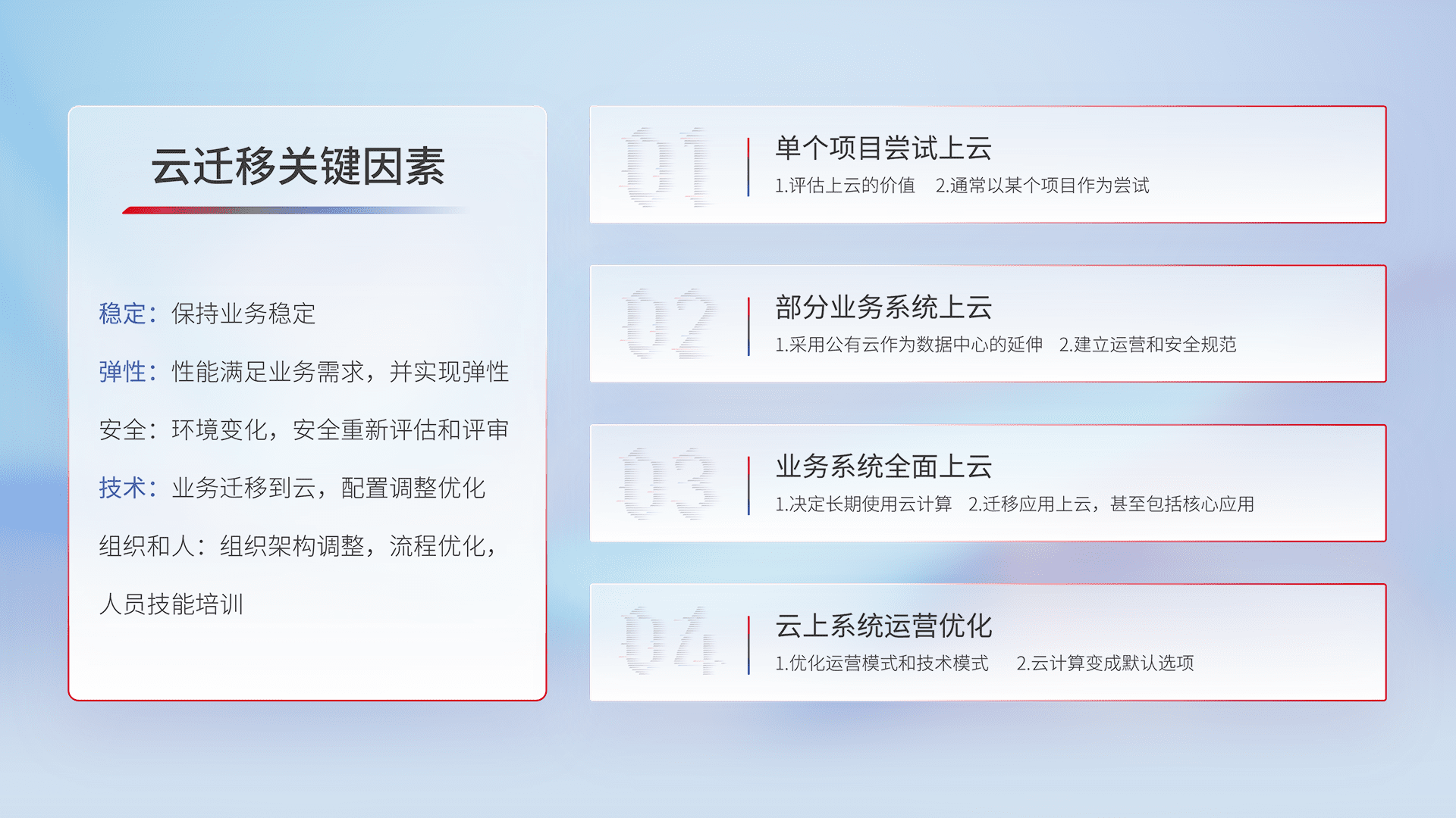 结合实际业务,,从规划设计、、、云平台选型、、、云原生改造、、数据迁移、、、、集成交付,,,,迁移全过程为客户识别最佳上云路径,,做好风险识别管理,,,,设计网络架构、、身份权限、、、安全审计合规、、、、操作审计、、、日志审计、、监控告警策略、、、、多站点容灾设计等,,对云上基础设施进行整体规划,,提升IT治理水平,,以满足弹性、、、、高可用、、、高性能的需求。。