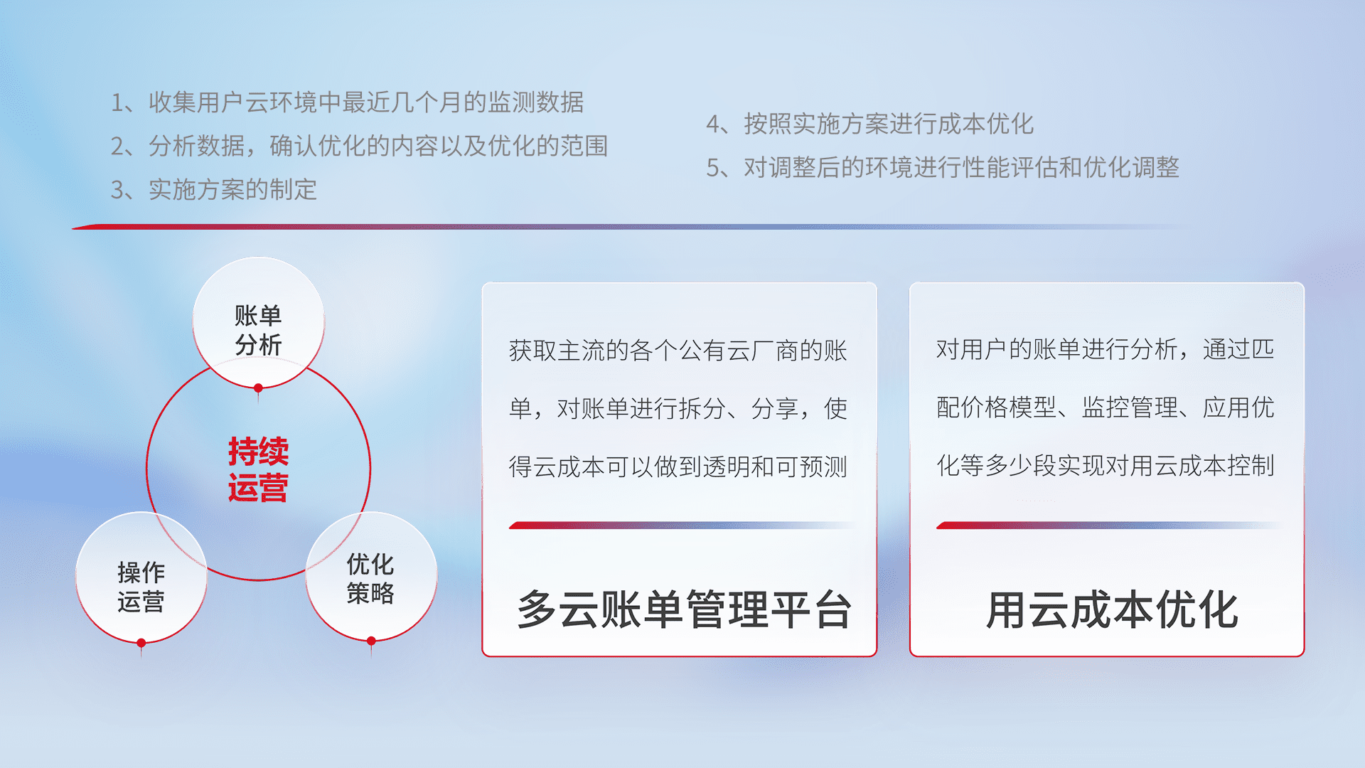 通过多云纳管,,以统一的资源数据模型把客户的云资源进行抽象和封装,,进而实现对多云资源的统一操作,,,,保障云资源管理的可靠性、、、、稳定性与可用性。。。量身定制化运维内容,,配置、、开发运维、、、、补丁管理、、备份、、、监控、、、、认证和访问管理、、审计和日常巡检等,,保障在用云过程中的可靠度,,稳定度以及高可用率。。。