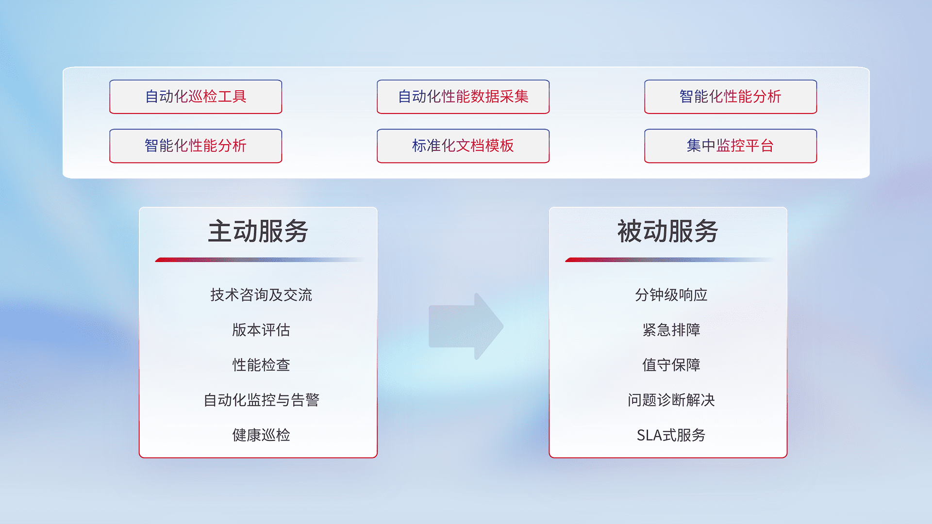 智能化工具和标准化文档,,,保障服务质量,,,,提供主动服务(包含技术咨询、、、、版本评估、、性能检查、、、自动化监控与告警、、健康巡检)和被动服务包含(分钟级响应、、、紧急排障、、、、值守保障、、、、问题诊断解决、、、、SLA服务)。。